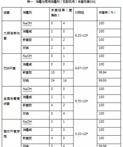 2%NaOH水溶液、湖南五指峰生化有限公司生產(chǎn)的消毒威1:1200倍稀釋、新菌敵1:500倍稀釋、好典1:300倍稀釋的水溶液(現(xiàn)配現(xiàn)用),作用5分鐘對大腸埃希氏菌、多殺性巴氏桿菌、金黃色葡萄球菌、蠟狀桿菌芽孢的殺滅率99.9%以上,其消毒效能符合規(guī)定。